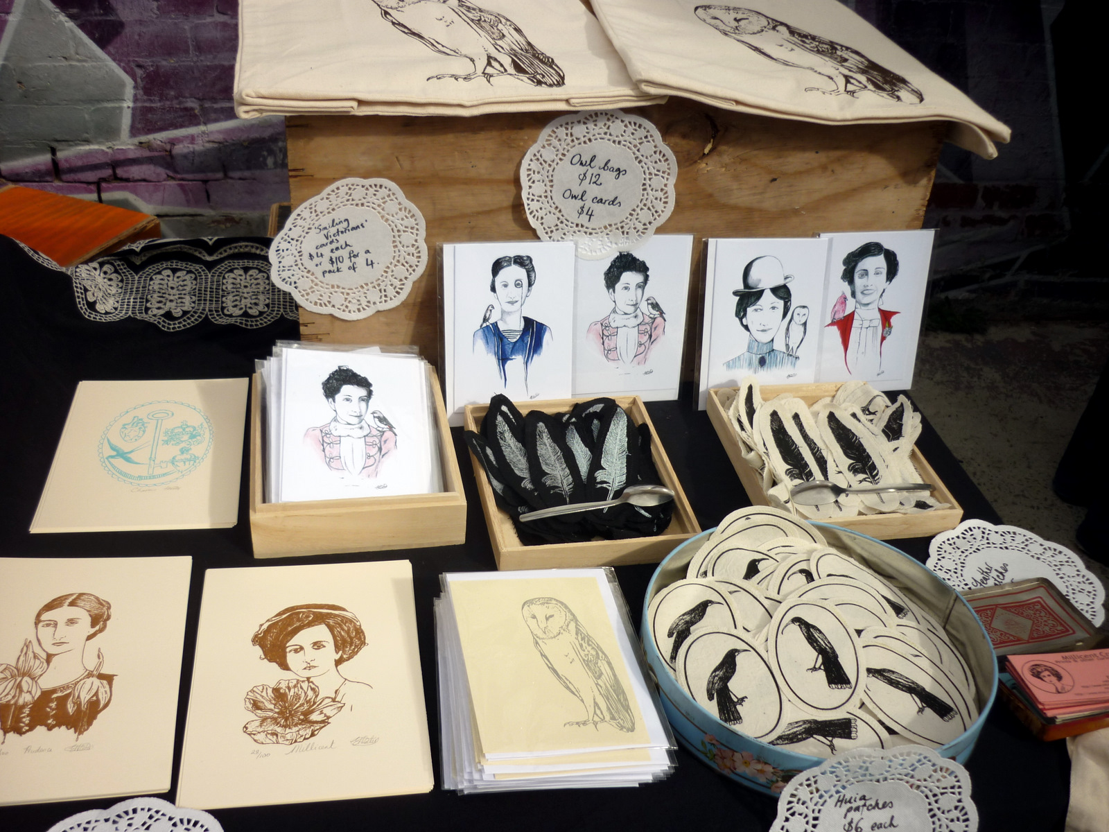 My blog archives tell me that this blog is a year old! Which conveniently coincides with my own birthday. So to celebrate, I thought I'd have a bird day giveaway, with a bird-themed prize pack. I'm giving away two feather patches, two huia patches (with a male and female huia) and two gocco-printed cards with a new owl design.