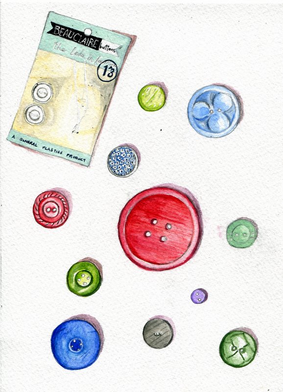 Here's another watercolour for my new "Collections" zine. Some of these buttons and the old button packaging are from my nana's sewing box, but I took a few liberties with the colours. Next up is a shell collection...some of the shells are proving a bit of a challenge to draw!