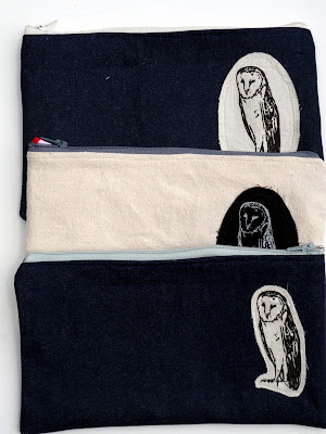 They're denim and canvas and they all have screen printed patches. I've been having lots of fun with that green ink.